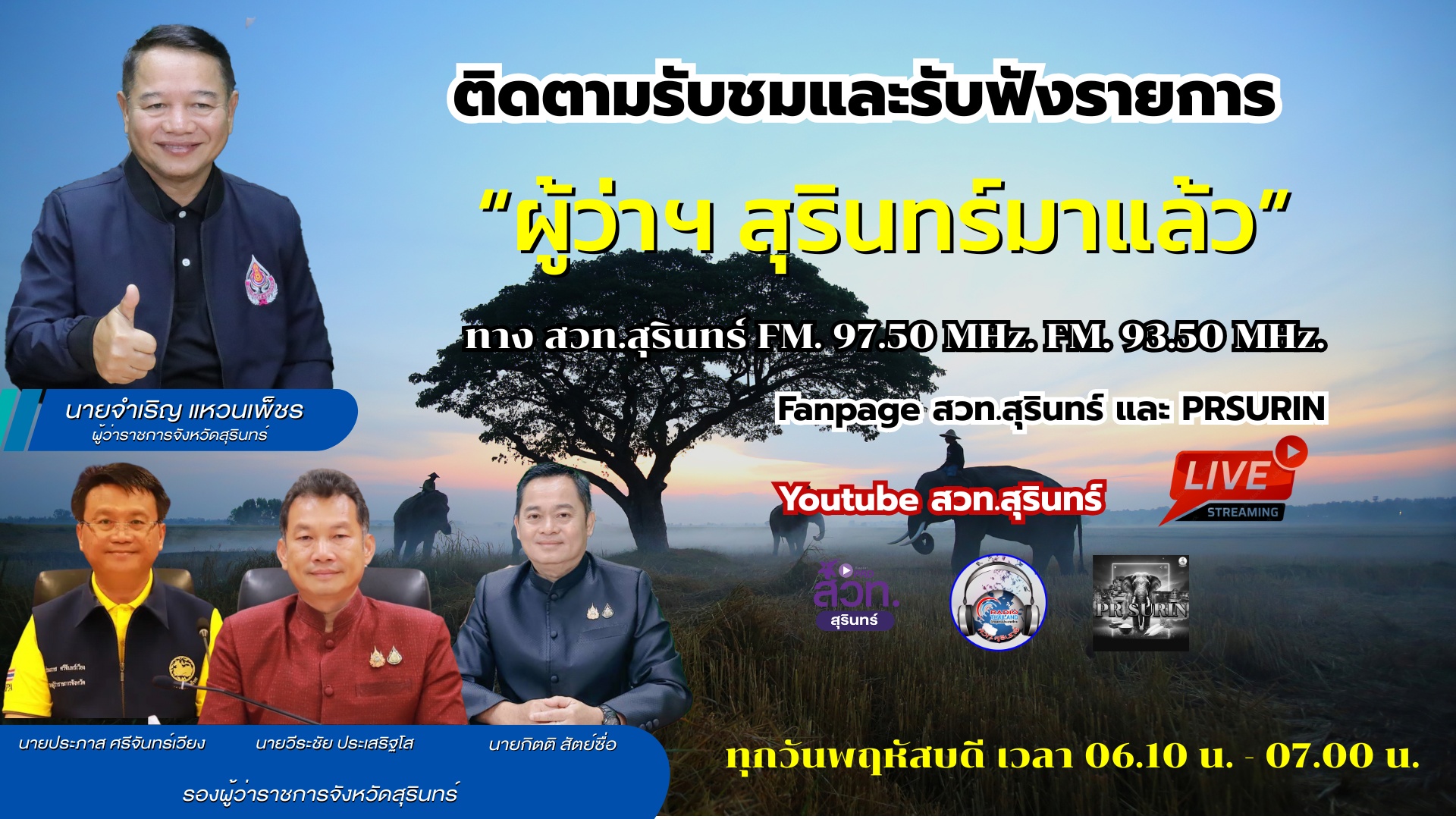 รายการผู้ว่าฯสุรินทร์มาแล้ว ออกอากาศสดทุกวันพฤหัสบดี เวลา 06.10 - 07.00 น. ทาง FM 97.50 MHz. FM 93.50 MHz. และทาง Fanpage สวท.สุรินทร์ และ Fanpage สำนักงานประชาสัมพันธ์จังหวัดสุรินทร์.///
